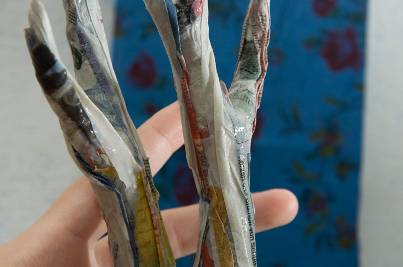 Now that the base is done, we will work on the surface: Take fine strips of newspaper and twist and fold them a little. Then attach them to the antlers with your wallpaper paste using a screwdriver or something similar to give your antlers the typical, slightly furrowed surface.