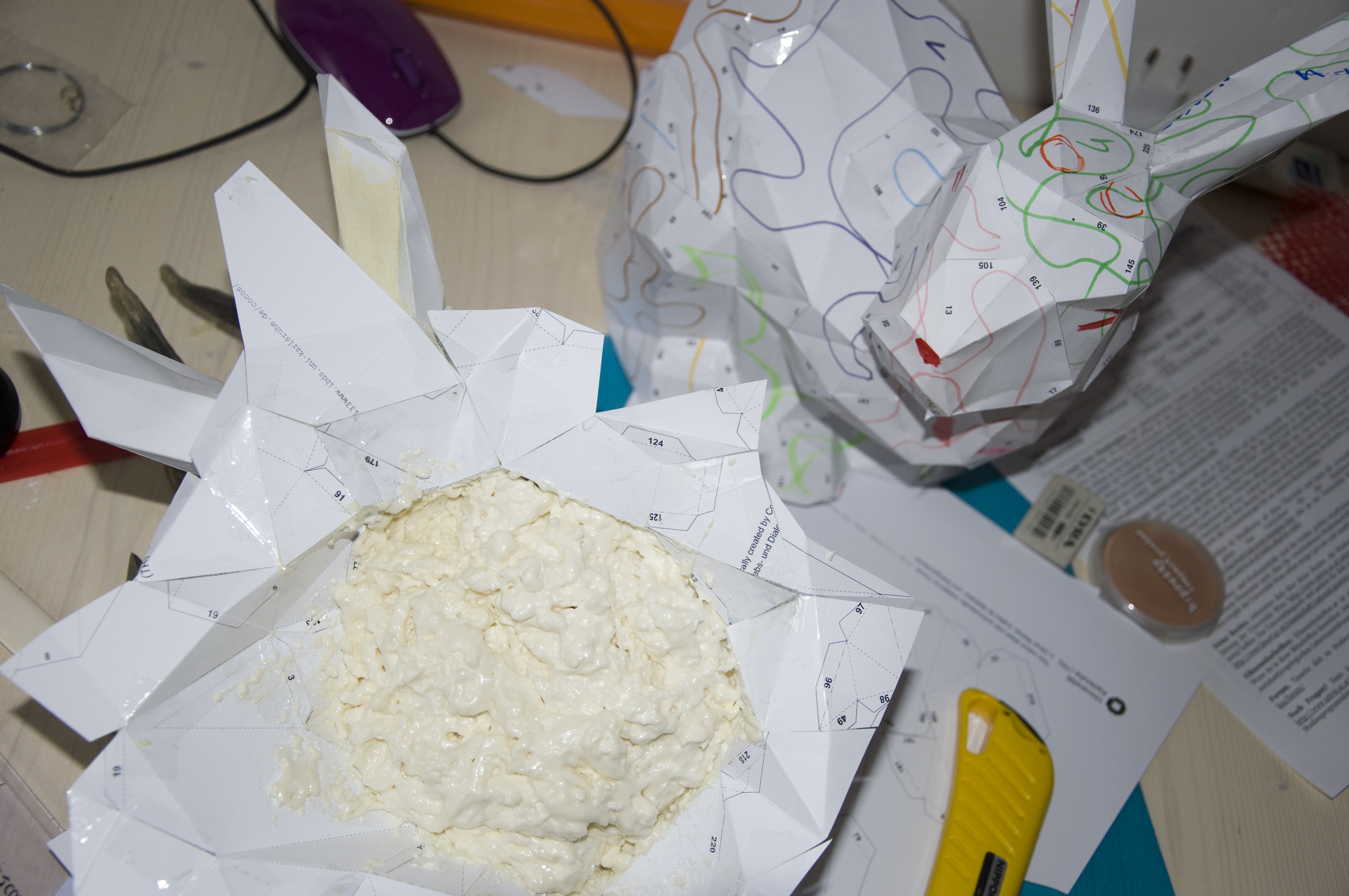 Erst habe ich das Geweih gebaut. Der Hase ist dann aus dickem Papier gefaltet, mit PU-Schaum gefüllt (in dem Schritt habe ich auch das Geweih eingebaut) und auf eine Holzplatte montiert. Anschließend habe ich den Hasenkopf mit einer Schicht zerknülltem Seidenpapier überzogen und alles weiß lackiert.