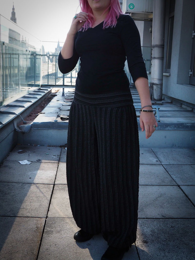 They are a modified version of the pattern I drafted for the turquoise/teal pair of pants I sewed last year … Isn’t it great to be able to make something exactly the way one needs it?