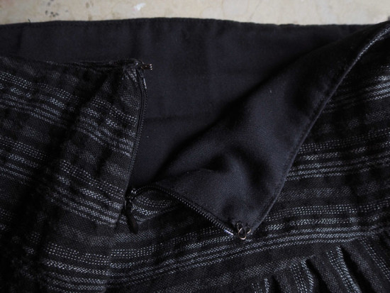 My stripey pants have a zipper with a hook and eye closure on top. The zipper is really long (I think 28 centimetres, or even 30), because my leg’s mobility was pretty restricted, and it was quite bulky because of the bandages.