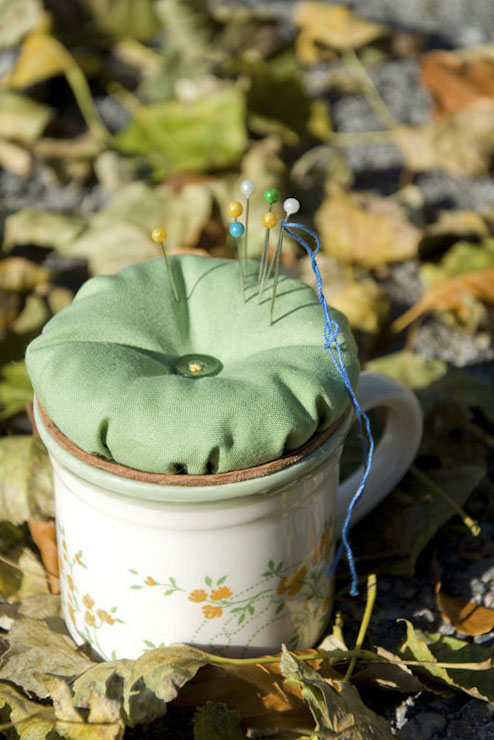 Die ganz Grundsätzlichen Nähutensilien, die eh nur in Zusammenhang mit einem Nadelkissen etwas taugen sind jetzt immer in der Nähe des Nadelkissens, das ist unglaublich praktisch wie sich herausgestellt hat. Außerdem steht das Nadelkissen so sehr stabil, weil die Tasse verhältnismäßig schwer ist und der Deckel gut draufsitzt.